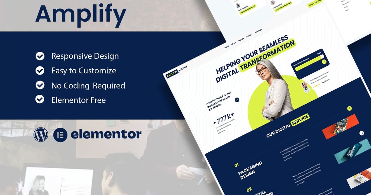 Amplify is Elementor Template Kit for digital marketing agency website. It has simple and clean design with modern layout style. Designed to use with Elementor Free version, ready to import and reusable for Digital Agency, Creative Agency, Digital Marketing Agency, Online Portfolio, Designer and Freelancer website for companies or individuals. It works with most themes and is optimized for use with the free Hello Elementor theme.