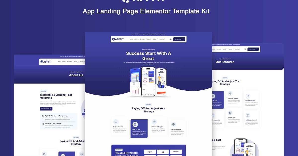Appfit is an Elementor Pro Template kit suitable for online payment gateways, fintech companies, app landing pages, startups, and all other real estate websites and businesses. This template kit includes 12+ Pages that have a simple, modern, and clean design with a 100% responsive layout, and very easy to customize, and can be used by anyone who designed & developed by planning, designing, and creating them for guaranteeing customer’s happiness and satisfaction.
