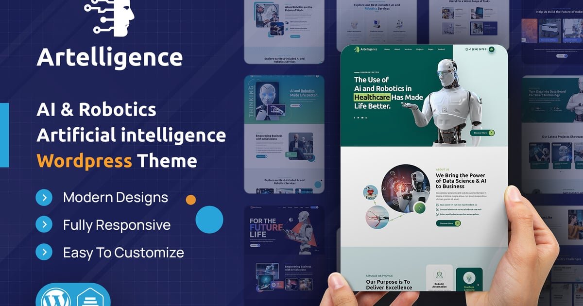 Artelligence is an ideal WordPress theme for your Robotics company. It is the best vector theme because it is built with Bootstrap 4 and includes the most important elements for a Robotics website, such as a case studies and a Banner slider. This theme is truly called Modern Web Robotics & WordPress theme because we used minimal CSS to create it, which means it is SEO friendly and fast loading. This web Robotics theme was created with fully responsive premium quality in mind. Artelligence is highly recommended for those who are searching for unique and modern theme to showcase their expertise in the field of Machine Learning, Education & Sciences, Predictive Analysis and Robotics Animations. This Multi-purpose theme includes a powerful page builder, and a plethora of shortcodes to complete your custom Robotics website design.