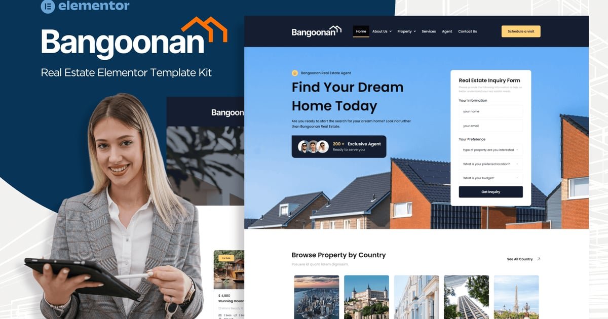 Bangoonan is a Real Estate and Property Agent Elementor Template Kit. Perfect for property agencies, brokers, and realtors, Bangoonan offers a range of design templates to help you create a stunning website that will stand out from the crowd. With its sleek, modern design, this template kit is packed with all the essential features you need to promote your property listings, including property detail and listing pages, agent profiles, and contact forms. Its intuitive interface ensures seamless navigation, while its responsive design guarantees your site will look amazing on any device. Upgrade your online presence with Bangoonan today!