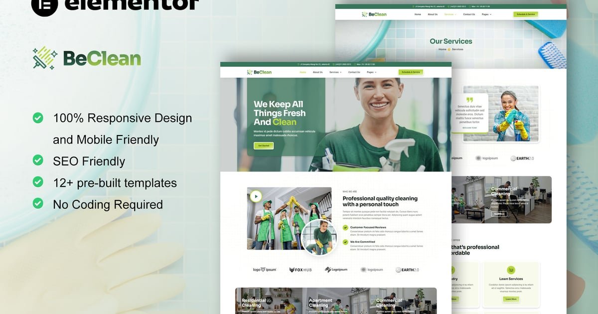 BeClean is an Elementor Template Pro Kit for Cleaning Services website. This template kit will help you to create any website related to cleaning services website such as home cleaning, laundry, cleaning service, home maid, commercial cleaning, home maintenance, home sanitization, resort cleaning, office services, and any services related to houseworks and cleaning services. It has 12+ pre-built templates with clean design and modern style.