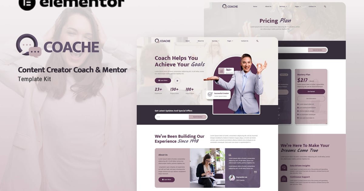Coache is is an Elementor Template Kit for quickly and easily creating websites for your business using the Elementor Page Builder plugin for WordPress. This is not a WordPress theme. Template Kits contain page content for Elementor page builder. This kit has been optimized for use with the free Hello Elementor theme but may be used with most themes that support Elementor.