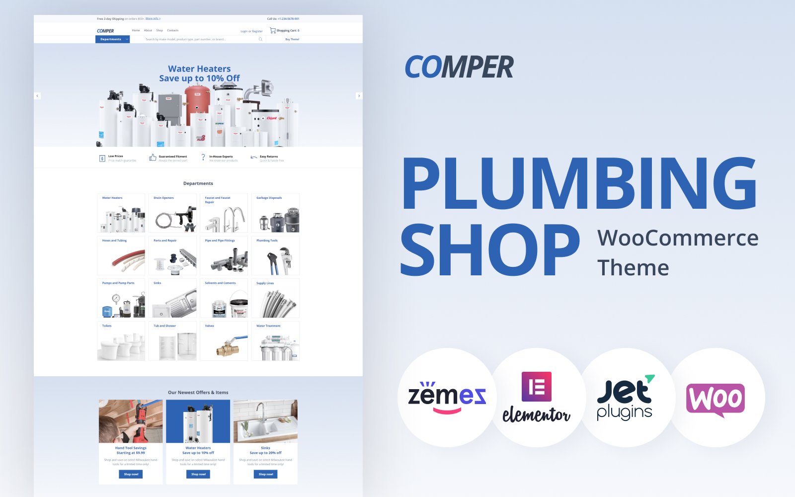 Your online shop specialized in plumbing products will become more competitive and professional with Comper theme. You will be able to present products by categories, inform about special offers, discounts and new arrivals in the most convenient and user-friendly way. Also, it will be possible to provide information about your store and contacts. You will customize your website according to your needs and taste using a powerful functionality of Comper theme. It includes a strong Jet plugins bundle for Elementor page builder, which will be useful by creating a website of your dream. With JetWooBuilder plugin you will create WooCommerce templates and showcase products and their taxonomy easily. JetProductGallery plugin will allow displaying product images in the form of a stylish gallery without any coding knowledge. Using JetMenu plugin you will create mega menus with drop-down sections and apply different style settings to them. You will add AJAX filters to the pages with products using JetSmartFilters plugin. Your eCommerce website will look engaging and modern thanks to a responsive Comper theme.