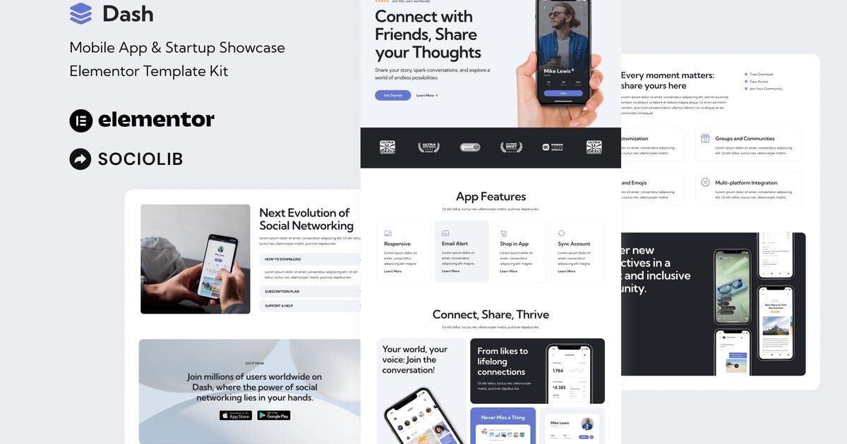 Dash is an Elementor Template Kit for quickly and easily creating Mobile App & Startup Showcase website using the Elementor Page Builder plugin for WordPress. Suitable for Mobile App, Application, Download, Startup, Social Media, Agency, etc. Style your WordPress website with this creative and modern webdesign style template kit to bring a modern feel to your blog.