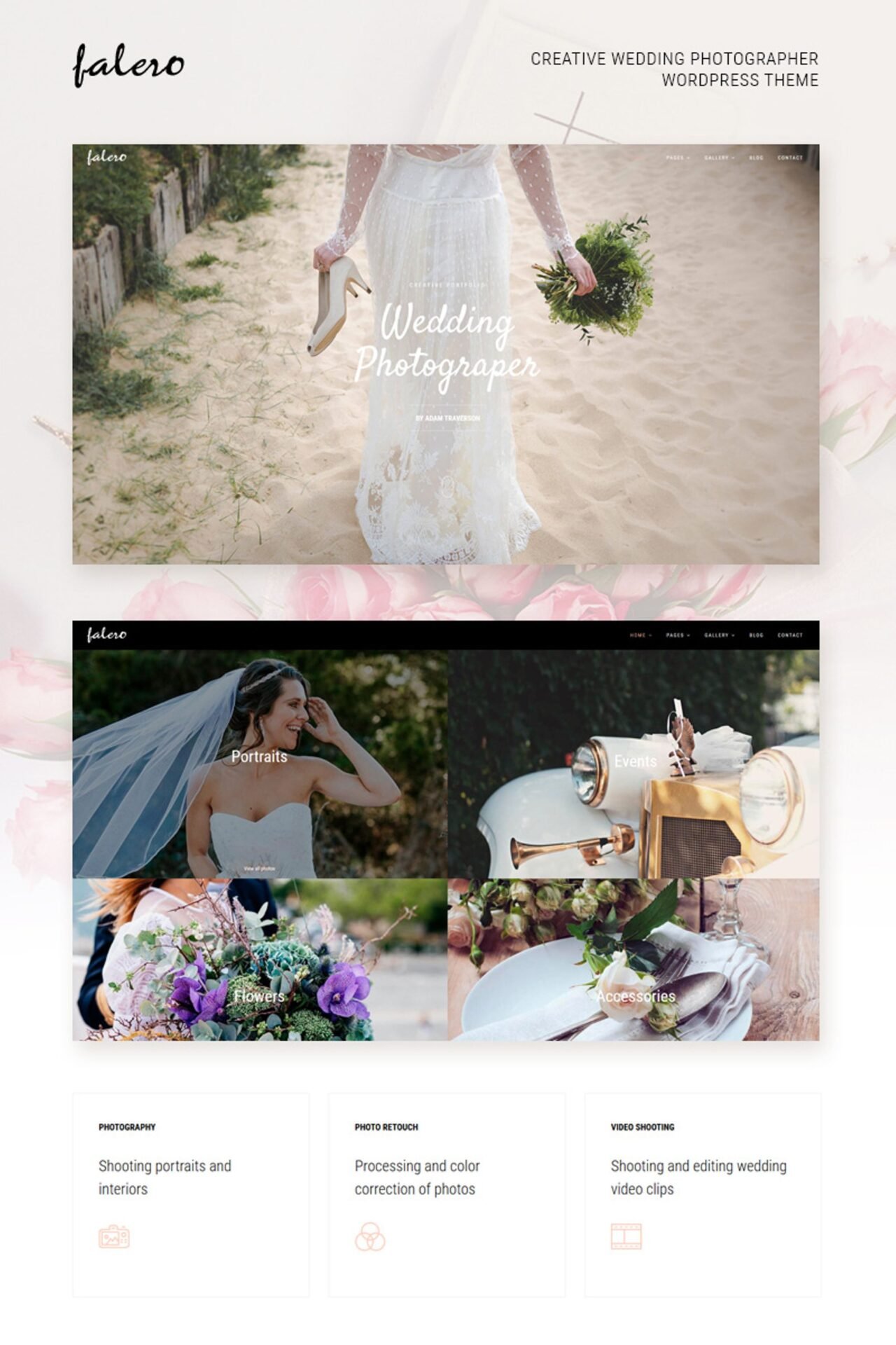 Falero WordPress theme, for professional and novice wedding photographers. It is perfect not only for wedding photographer themes, but also for any photographer’s style, like landscapes, portraits, pre-flight photography, advertising photography and others. The template has all the necessary pages, information about the photographer, how to contact, a blog, a gallery.