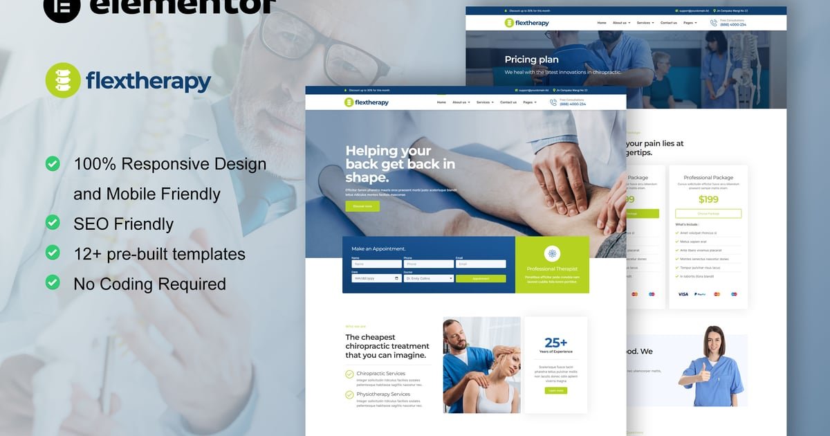 FlexTherapy is Elementor Template Kit for Chiropractic & Physiotherapy service. This template has modern layout with simple, professional and clean style. Suitable for any business related to Chiropractic. You can easily build Chiropractic & Physiotherapy service website then offer your services such as chiropractic chiropractic, sport injury rehabilitation, physiotheraphy service, posture correction, injury prevention, wellness and counseling.