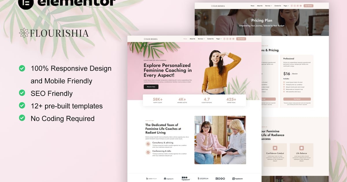 Flourishia is an Elementor Pro Template Kit for feminine business coaching, suitable for any agency that helps women to grow their business such as interior design, design agency, digital products, fashion, health, art wellness, and beauty website service. It has 12+ pre-built templates with beautiful, professional and modern style. Save your time and make business woman website easily with this elementor template kit.