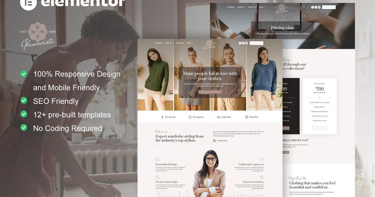 Glamourista is elementor template kit for fashion designer service website. This template kit is perfect for fashion designer and its related service such as fashion designer website, fashion design consultation, cloth custom design, personal styling, fashion production, fashion stylist, fashion collection, fashion gallery, boutique, etc. It has 12+ pre-built templates with simple design and modern style. You can easily make beautiful website to show your fashion design & personal styling project with this elementor template kit.