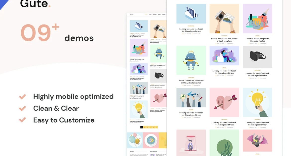 Gute is a modern News & Magazine Elementor WordPress Theme that perfect to create a fully working News portal, Magazine site, Personal Blog, Editorial site, and for all kinds of publishing websites. Gute WordPress Theme is used the Elementor Free page builder plugin, This Template easily customizable, fully responsive and support all modern browser and device. No coding knowledge is required to edit demo designs.