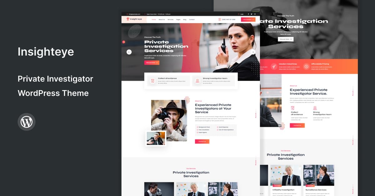 insighteye is built as a clean and modern responsive Private Investigation service WordPress theme. This theme is perfectly designed and organized for any kind of private investigation, security and detective work etc. You can easily modify and extend the theme layouts.