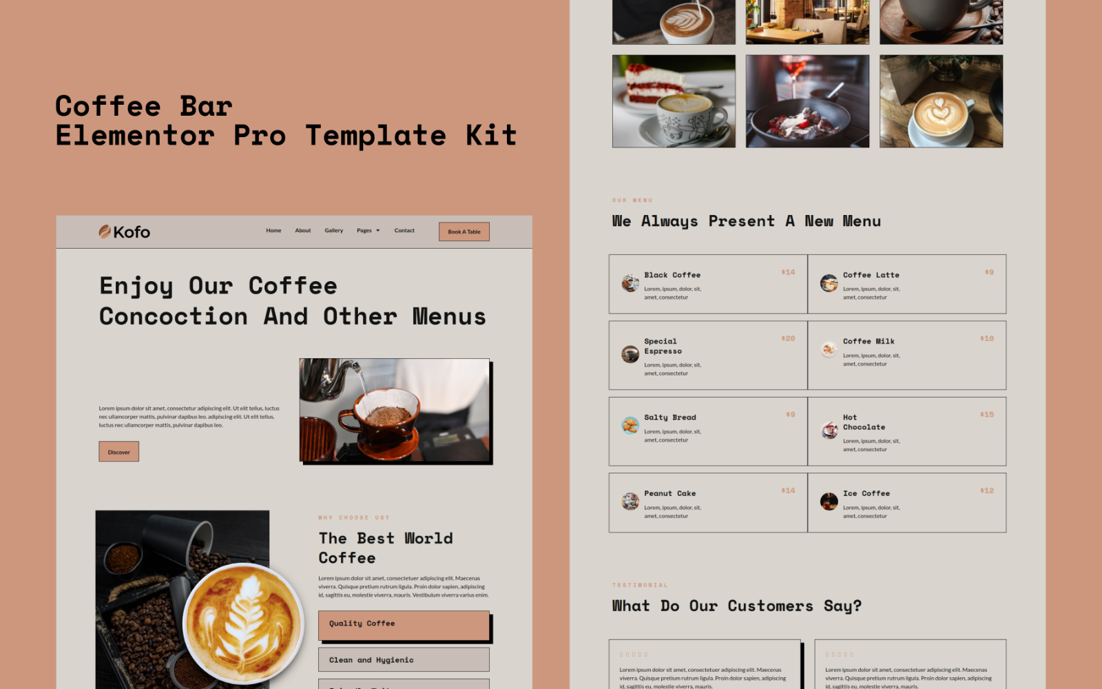 Introducing the Kofo Coffee Bar Elementor Pro Template Kit, a meticulously crafted digital masterpiece designed to elevate your coffee shop’s online presence to new heights of sophistication and elegance. This exquisite template kit is a true testament to the art of coffee, seamlessly blending modern aesthetics with timeless charm. Immerse your customers in a world of refined taste and aromatic delights with the stunning homepage layout, featuring a captivating hero section that showcases the essence of your coffee bar. The meticulously designed menu page allows you to effortlessly display your tantalizing coffee creations, enticing visitors with mouthwatering descriptions and captivating imagery.