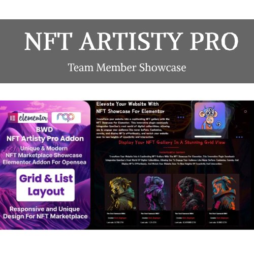 NFT Artistry Pro Addon for Elementor: Elevate your website with stunning NFT galleries. Seamlessly integrate NFTs, showcase details, and real-time market data. Effortlessly create an immersive NFT art experience without coding.”