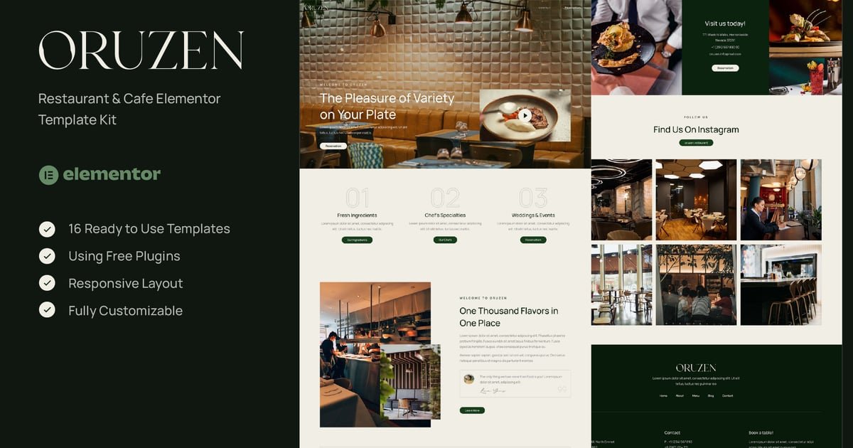 Oruzen – Restaurant & Cafe Elementor Template Kit (NOT a WordPress Theme) created especially for Restaurants, Fast Food, Bakery, Cafe, Food Shop, Tea/Coffee Shop, Seafood Restaurant, Catering, Food Business Websites. Oruzen has a simple, modern and clean design with 100% responsive layout, and very easy to customize and can be used by anyone without having to understand coding.