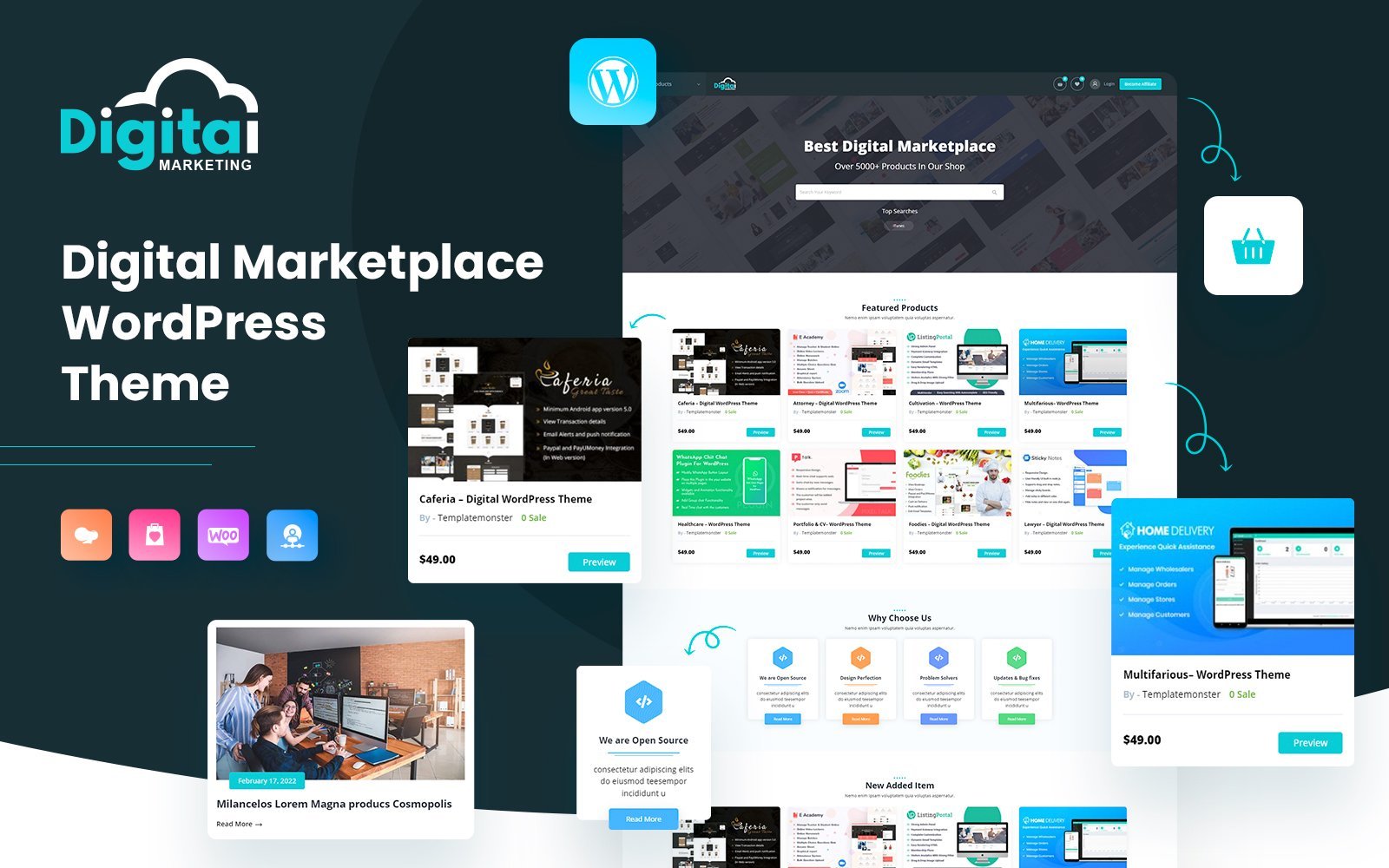 Theme perfectly depicts featured products section, Newly added items including current affairs and News blog section, giving it a complete look for running a digital downloads and marketplace.