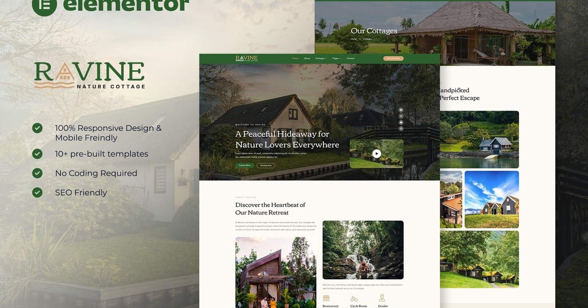 Ravine is modern and elegant Elementor Template Kit for nature cottage websites. You can also use this creative template kit for accommodation, adventure, backpacking, campground, camping, cottages, glamping, hiking, mountain, nature, outdoor, park, tour, trekking, etc. Ravine has a simple, modern and clean design with 100% responsive layout, and very easy to customize and can be used by anyone without having to understand coding.