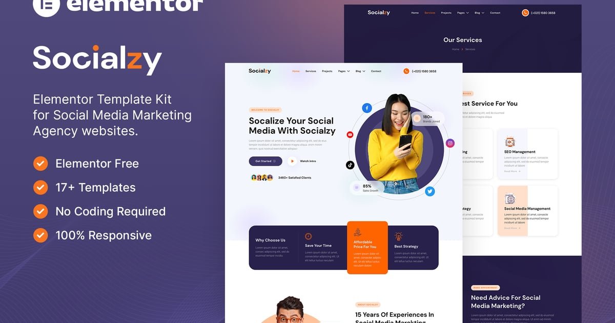 Socialzy is a modern ready-to-use Elementor Template Kit specially designed