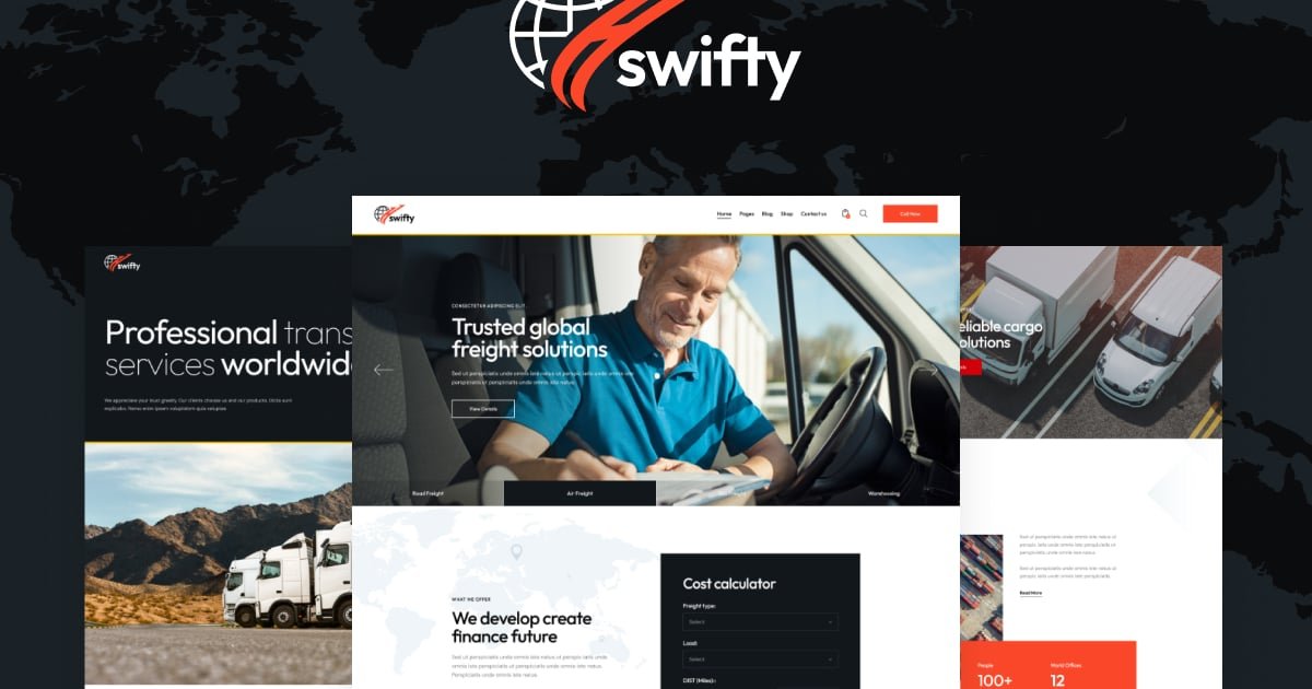 Swifty is a stylish, modern, and powerful Cargo Transportation and Logistics WordPress Theme with a high-class business design perfect for contemporary trucking agency, transportation bureau or logistics firm. Also, it fits warehousing, transportation, corporate shipping company, package delivery, and freight services.