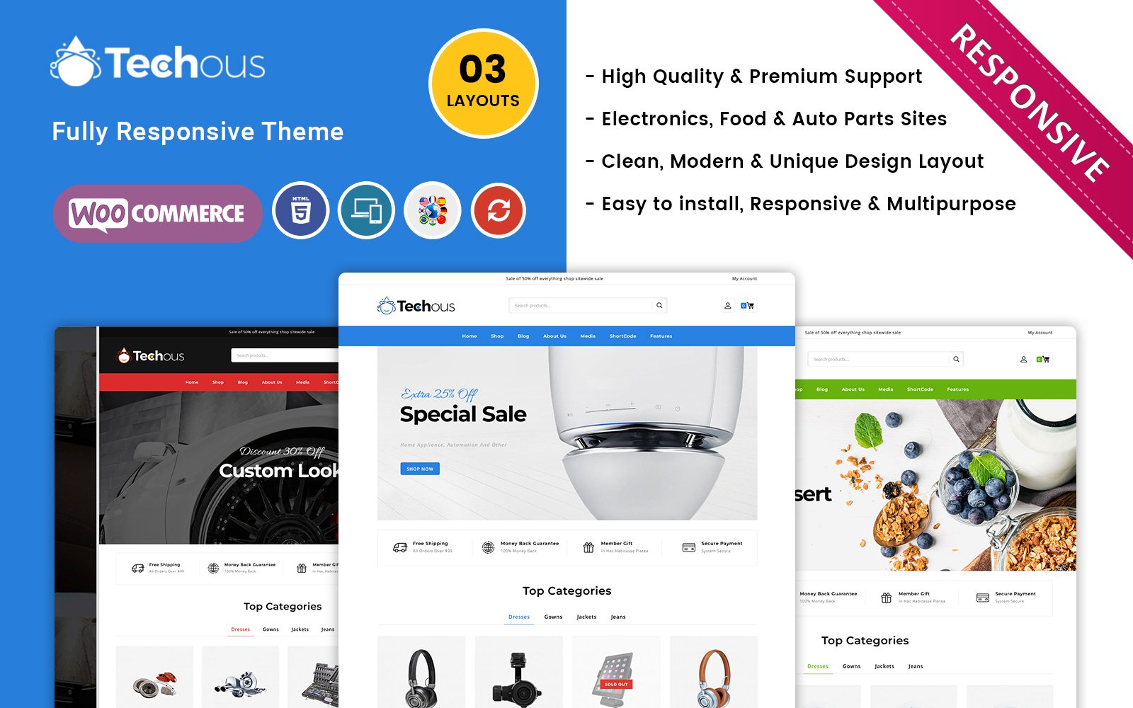 - Techous is a fully functional theme for any eCommerce website that includes features like daily offers, Quick view, Mega menu, customer banner slider, products slider, category tab, and blog.
