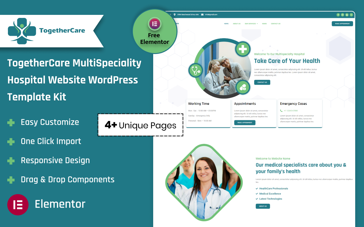 Introducing Together Care Multi-specialty Hospital WordPress Elementor Template Kit – a comprehensive hospital solution perfect for multidisciplinary medical centers aiming to expand their reach and provide exceptional patient care. This meticulously constructed template kit blends aesthetics and functionality, delivering a striking first impression while maintaining a user-focused approach.