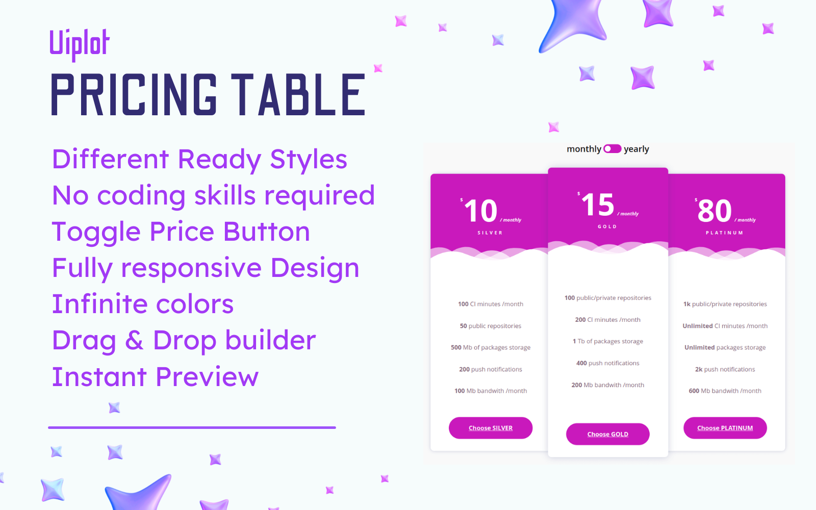 Unlock the power of seamless pricing table creation with Uiplot Pricing Table, a WordPress plugin. Say goodbye to complex coding tasks and hello to visually stunning pricing tables that elevate your website to new heights.