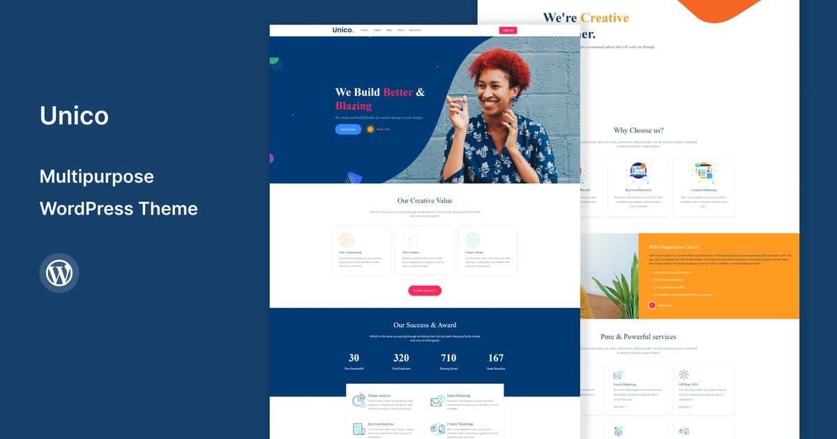 Unico is a responsive, creative, powerful and multi-purpose WordPress Theme and one page template with the latest web design trends for today’s technical era. In this template we are provided multipurpose templates and services ready to use as Homepage templates, Startup, Business, SEO/SMO, Landing Page, Digital Marketing, Software Mobile App, Corporate, Digital Studio, Weddings, Creative Design, Business & Corporate, and other more templates coming soon as Shop & Retail, Hospital, Personal Resume, Construction for different busines.