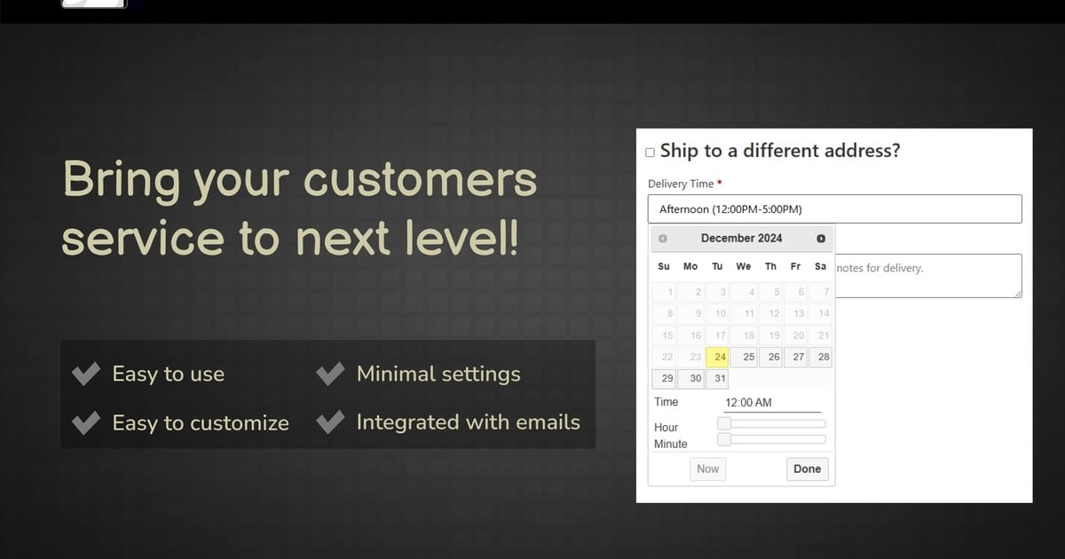 Woocommerce Delivery Time Picker for Shipping is a WooCommerce addon that allows customers to pick a date and time for delivery when shipping on the checkout page. Customers can select a specific date and time for shipping in an intuitive and user-friendly widget. The delivery time will be visible to site administrators when viewing the order in the admin area. It also will be sent via emails to administrators.